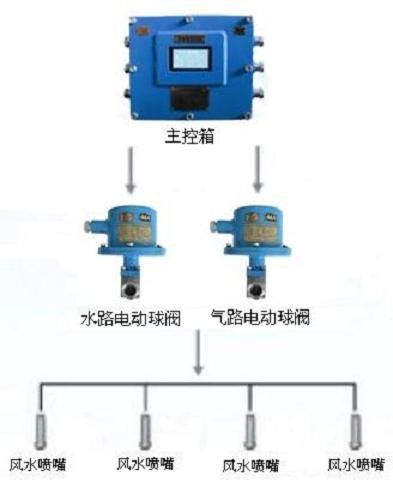 當(dāng)傳感器探測到控制信號(hào)時(shí),信號(hào)送入主控箱,主控箱先后控制高壓風(fēng)閥、高壓水閥開啟,將高壓風(fēng)、高壓水輸送到風(fēng)水噴頭(即氣水噴頭)進(jìn)行噴霧降塵(風(fēng)水噴頭可對(duì)風(fēng)水壓力大小進(jìn)行調(diào)整),噴霧工作至延時(shí)時(shí)間(延時(shí)可調(diào))停止噴霧降塵;當(dāng)信號(hào)再次觸發(fā)時(shí),進(jìn)行下一個(gè)工作循環(huán)過程。
